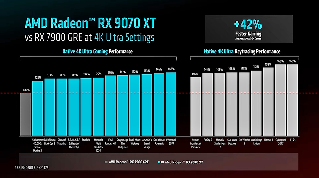 RX 9070 XT 4K 해상도에서 RX 7900 GRE보다 +42% 고성능