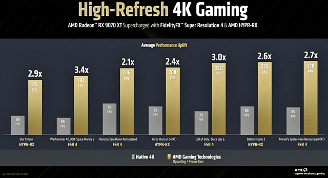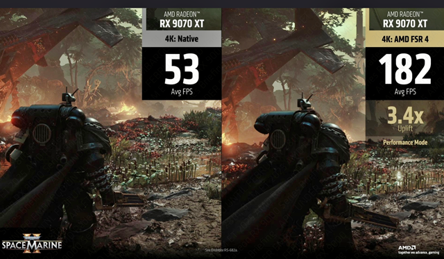 AMD가 이번 발표에서 FSR4의 예시로 든 게임 중에서 최신 고사양 게임 타이틀인 <워해머 : 스페이스마린 2> 를 보면, 4K 해상도에서 RX 9070 XT 로 초당 평균 53프레임이던 것이 → FSR4(퍼포먼스 모드) 적용 후에는 초당 평균 182 프레임으로 3.4배 향상된다.