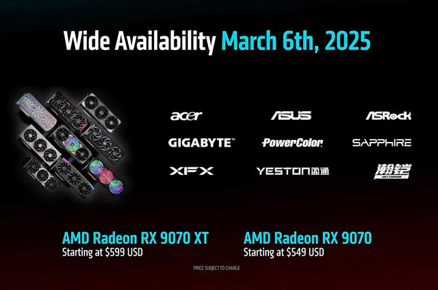 AMD 라데온 RX 9070 시리즈는 오는 3월 6일 전세계 소매시장에 판매 시작되며, 가격은 RX 9070 $549 부터 시작, RX 9070 XT $599 부터 시작하는 것으로 책정됐다.