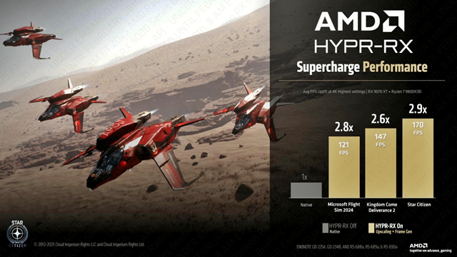 하드웨어만 개선한 것이 아니라 소프트웨어도 대폭 개선한다. AMD의 게이밍 지원 소프트웨어 패키지인 하이퍼 RX(HYPR-RX)를 이용하면, 최신 고사양 게임 타이틀인 <플라이트 시뮬레이터 2024>, <킹덤 컴 : 딜리버런스2>, <스타 시티즌> 등에서 최대 2.9배의 프레임을 확보할 수 있으며, 게임에 따라 3.4배 이상의 프레임 확보도 가능하다.