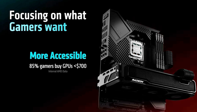 이번 발표에서 AMD는 "게이머의 85%는 미화 $700 이하의 그래픽카드를 구매한다"면서 이들*이 자사의 핵심 타겟이라고 언급했다. *미화 $700 이하의 그래픽카드를 구매하는 게이머들