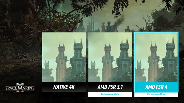 AMD가 이번 발표에서 FSR4의 예시로 든 게임 중에서 최신 고사양 게임 타이틀인 <워해머 : 스페이스마린 2> 를 보면, 4K 해상도에서 RX 9070 XT 로 초당 평균 53프레임이던 것이 → FSR4(퍼포먼스 모드) 적용 후에는 초당 평균 182 프레임으로 3.4배 향상된다.