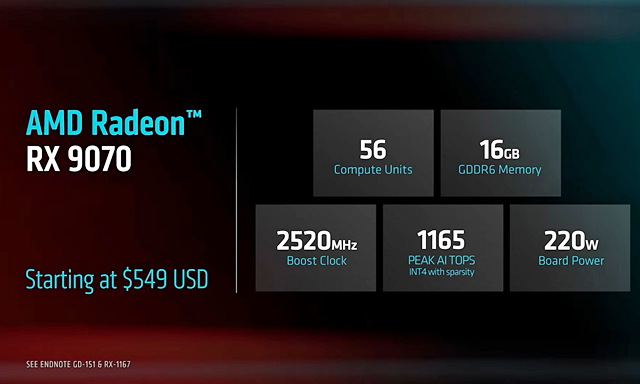 이번 발표에서 AMD는 자사의 라데온 RX 9070 XT와 엔비디아 지포스 RTX 5070 Ti를 경쟁구도로 꼽았다. AMD는 발표 자료에서 RX 9070 XT($549)는 지포스 RTX 5070 Ti($749)와의 비교에서 평균 -2%라고 주장했다. 게임에 따라 엎치락 뒷치락 하는 등 사실상 동급 그래픽카드임을 공언한 것.