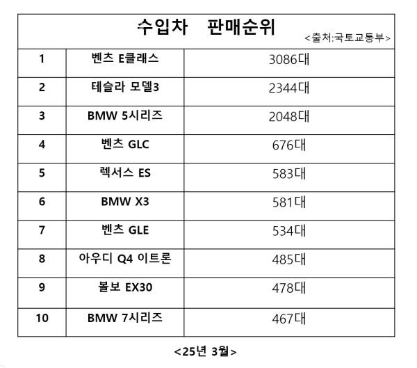25년 3월 벤츠코리아가 BMW를 꺾고 수입차 시장 1위 자리를 차지했다. 4월에는 닷 BMW가 1위에 올랐다. 이런 결과는 차종별 판매순위를 보면 알 수 있다.