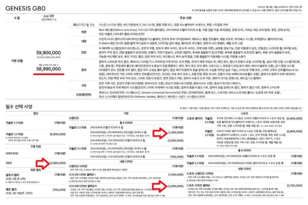 고급 브랜드인 제네시스는 가격대가 더욱 올라간다. G80 세단에 인기 옵션을 조합할 경우 실 구입가는 6000만원대 중반에서 7000만원 초중반 가격을 형성한다. 또한 최근 등장한 G80 블랙은 시작 가격이 8000만원이 넘어가는 8149만원이다.