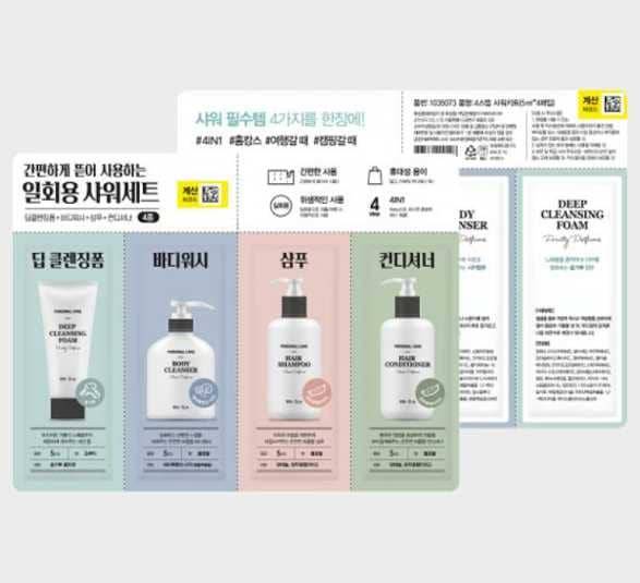 샴푸, 헤어 컨디셔너, 바디워시, 클렌징 폼이 한 번에 들어 있는 일회용 키트로 총 4세트로 구성되어 있는 제품인데요. 여행, 캠핑, 출창, 워터파크 등 이 제품 하나로 요긴하게 샤워가 해결 가능합니다. (가격:1000원 / 품번:1035073)