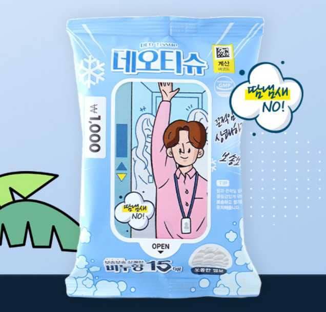 물티슈처럼 생긴 데오드란트 티슈로 땀나는 겨드랑이, 무릎 뒤쪽, 팔이 접히는 부분을 닦아주면 시원함을 선사하고, 산뜻한 비누향으로 땀냄새도 없앨 수 있는 제품입니다. 간편하게 휴대가 가능해 급할 때 쓰기 더욱 좋습니다. (가격:1000원 / 품번:1039707)