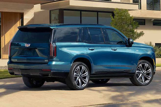 2025년형 에스컬레이드는 캐딜락 최신 전기차 디자인 언어를 반영하여 더욱 현대적인 외관을 자랑한다.