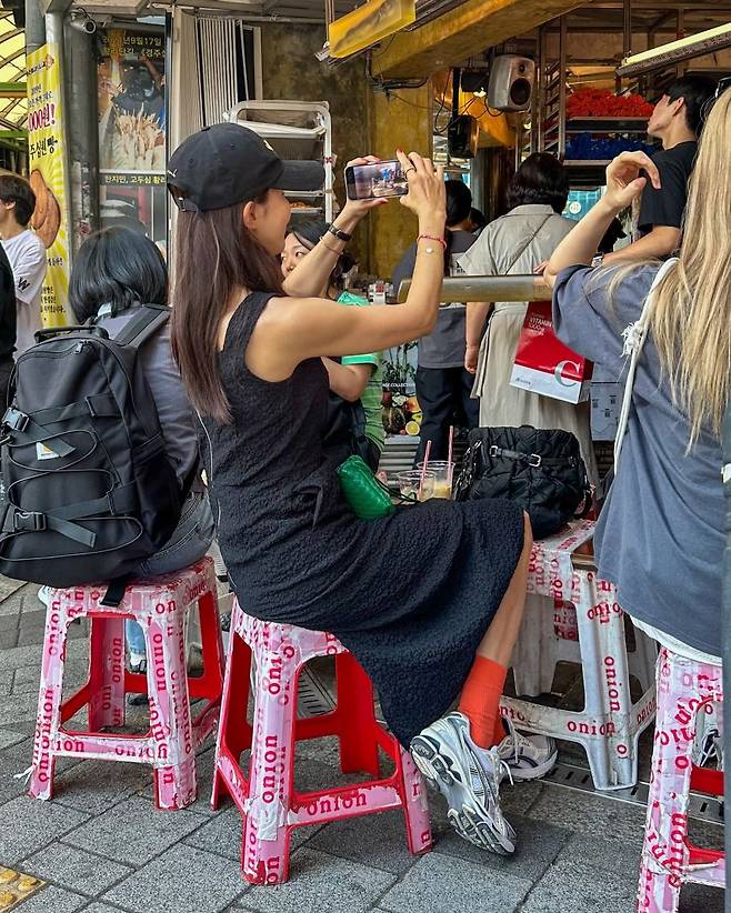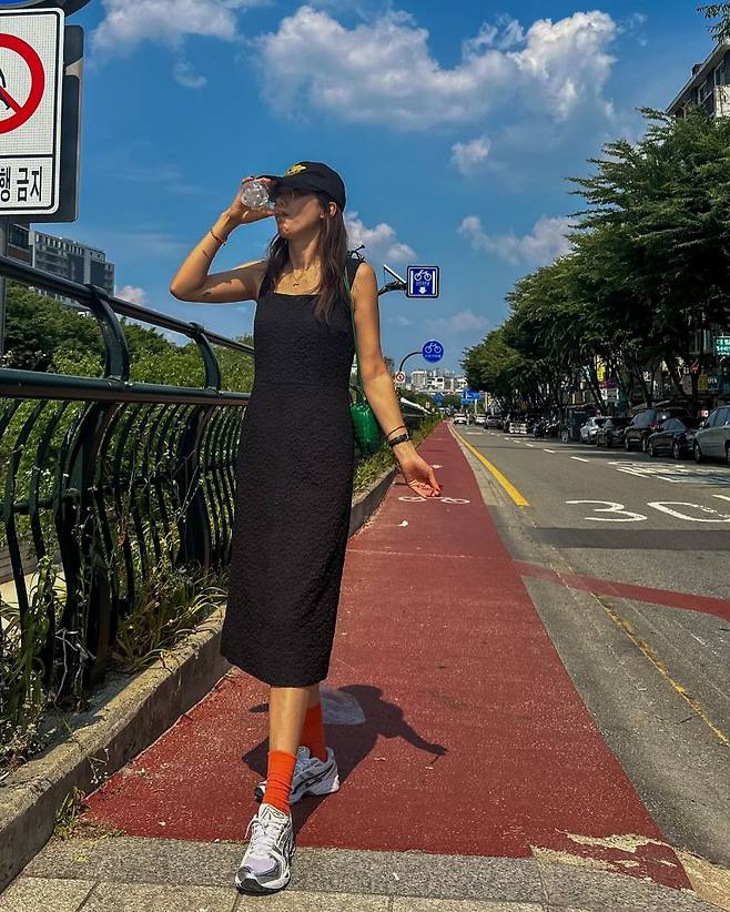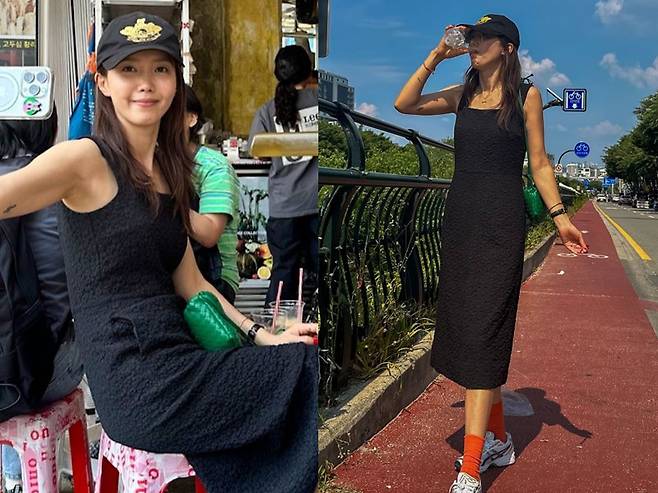 사진 속 채정안은 시원해 보이는 블랙 민소매 롱원피스에 캡모자를 쓴 캐주얼한 모습이다. 여기에 빨간 양말과 초록색 숄더백을 매치해 원색으로 포인트를 줬다.
