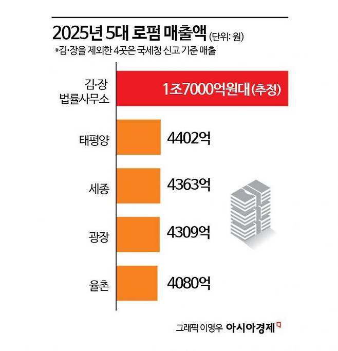 15일 법조계 따르면 김·장은 지난해 1조7000억원대(추정) 매출을 기록한 것으로 나타났다. 김·장의 2024년 매출액은 1조5000억원대로 추정된다. 태평양은 지난해 4402억원, 세종 4363억원, 광장 4309억원, 율촌 4080억원의 매출을 기록했다. 김·장을 제외한 4대 로펌의 매출액은 국세청 신고 기준이다.