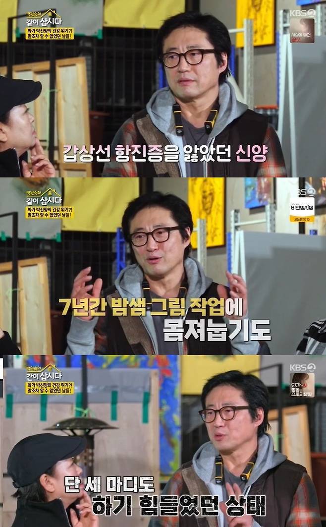 이에 박신양은 "물감과 세척액의 냄새가 너무 강하다. 그것도 모르고 7년 밤샘 작업을 하다 못 일어날 지경이 됐다"며 그때서야 공기 좋은 곳에 작업실을 구해야겠다는 생각을 했음을 밝혔다.