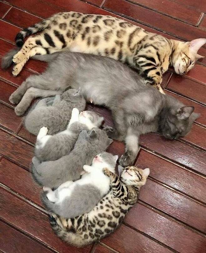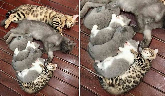 엄마 아빠를 똑닮은 아기 고양이들과 낮잠을 자고 있는데요