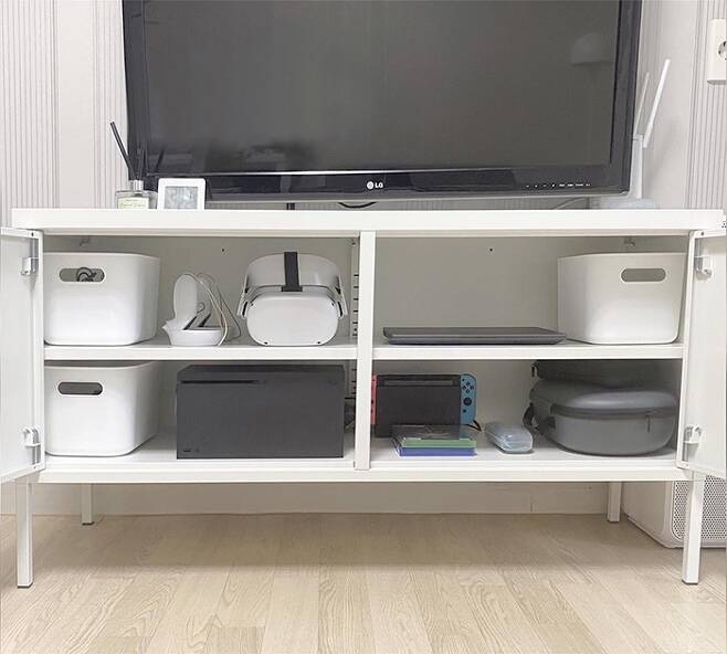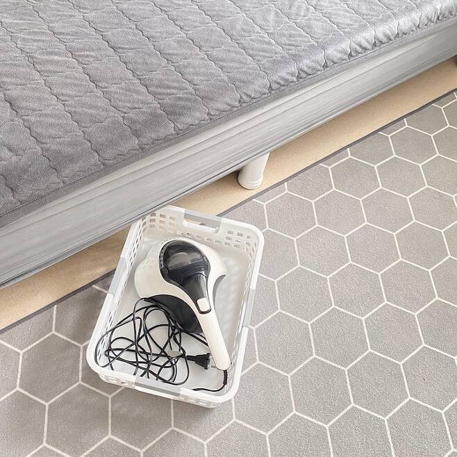 각종 전선과 조종기 충전기는 수납 바구니에 분리해서 넣어두면 필요한 것만 쏙쏙! 빼서 사용하면 돼요. 찾기도 쉽고 정리도 깔끔하게 되는 것 같아요~! 가구 밑이나 바닥에 불필요한 물건을 두거나 수납하면 청소하기 번거로워요! 저만의 빠른 청소 팁!