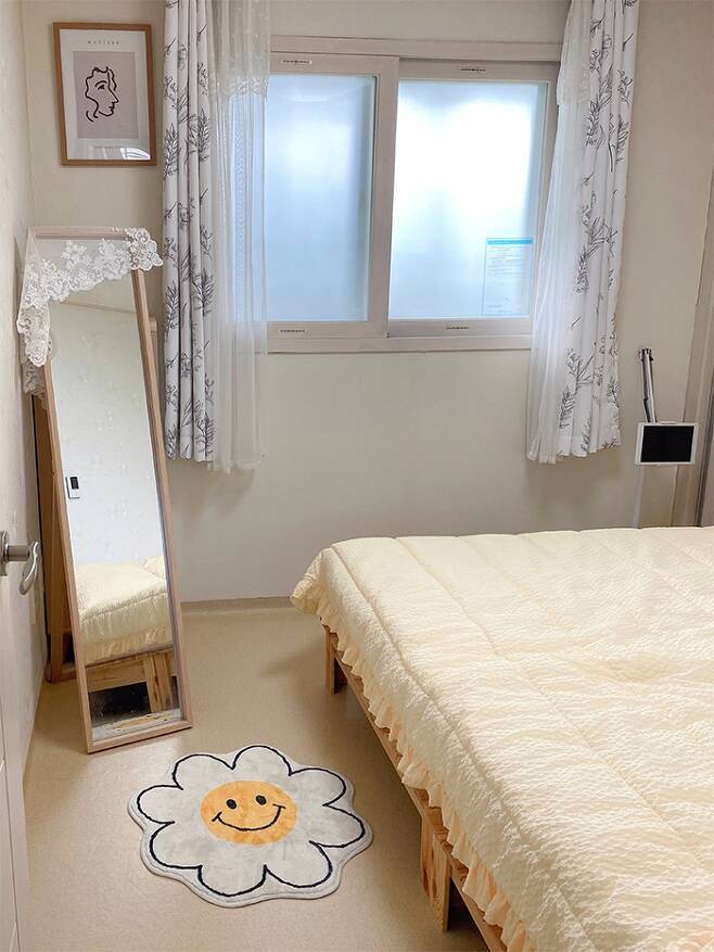 저희 집은 복도식이라 창문을 통해서 침대 쪽을 찍어보았어요~! 전신거울 뒤에는 슬림 서랍장이 쏙~ 숨어 있습니다^^