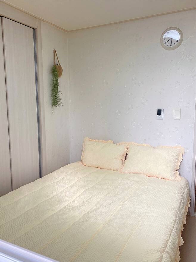 붙박이장이 있어서 따로 옷장이 없어요. 붙박이에 부부의 사계절 옷, 계절 이불을 모두 보관 중입니다. 공간이 협소해 침대를 붙박이와 가깝게 붙여 생활하는데 침대 위에서 옷을 꺼내야 하는 점만 빼면 큰 불편함 없이 사용 중이에요! 붙박이 아래쪽은 계절 이불을 보관하고요.