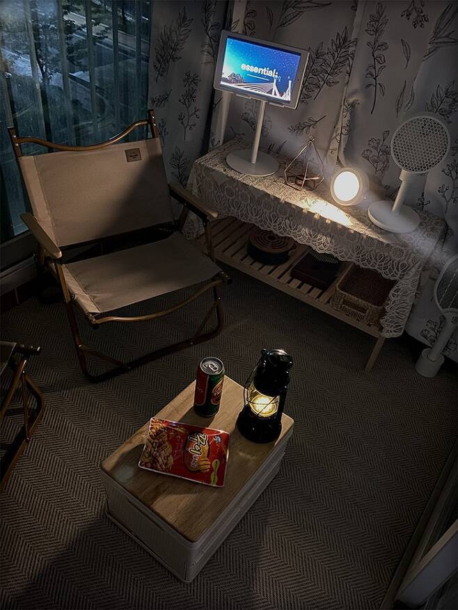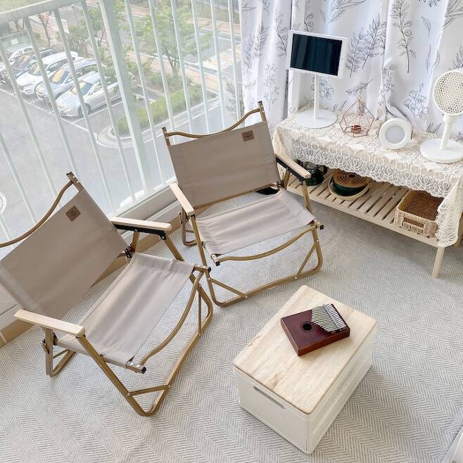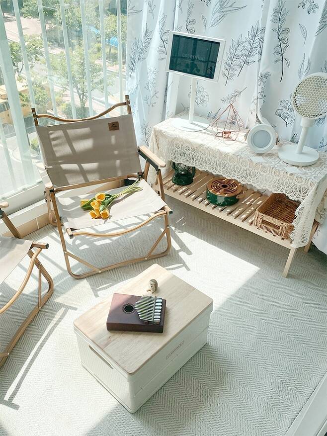 이제 캠핑을 시작한 지 1년 차! 미니멀이지만 캠핑용품은 나름 맥시멈! 수납이 부족한 탓에 한쪽 발코니 선반을 가득 채운 캠핑용품들을 가리기 위해 커튼을 달았어요. 거실 커튼과 동일한 커튼으로 통일감을 주었습니다. 그리고 갬성 캠핑용품들을 두고 베란다 캠핑을 즐기고 있어요^^ 요즘 아이들이 참 좋아하는 곳이에요. 햇빛을 맞으며 커피를 마시거나 핸드폰을 하면서 쉴 수 있는 작은 집 속 캠핑장이에요.
