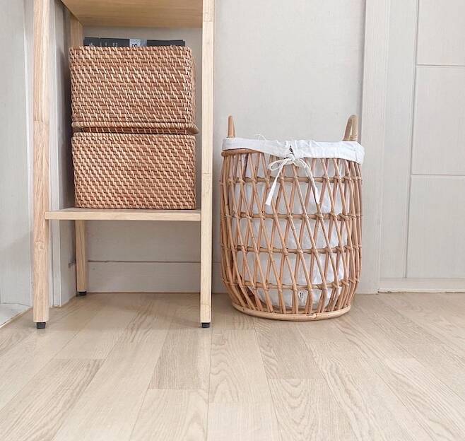 그리고 화장실 쪽입니다! 일하면서 뒤돌아보면 보이는 공간이라 돌아봤을 때 깨끗하다는 느낌을 받고 싶은 공간이에요. 욕실에 수납공간이 적은 탓에 수건을 따로 보관해야 해서 폭이 좁은 사다리 선반을 두어 수건을 수납하고 있어요. 위에 원형 바구니는 면봉이나 손톱깎이를 보관 중이고 하단 라탄 바구니에는 마스크를 수납해서 전체적으로 우드&라탄으로 분위기를 맞춰보았어요.