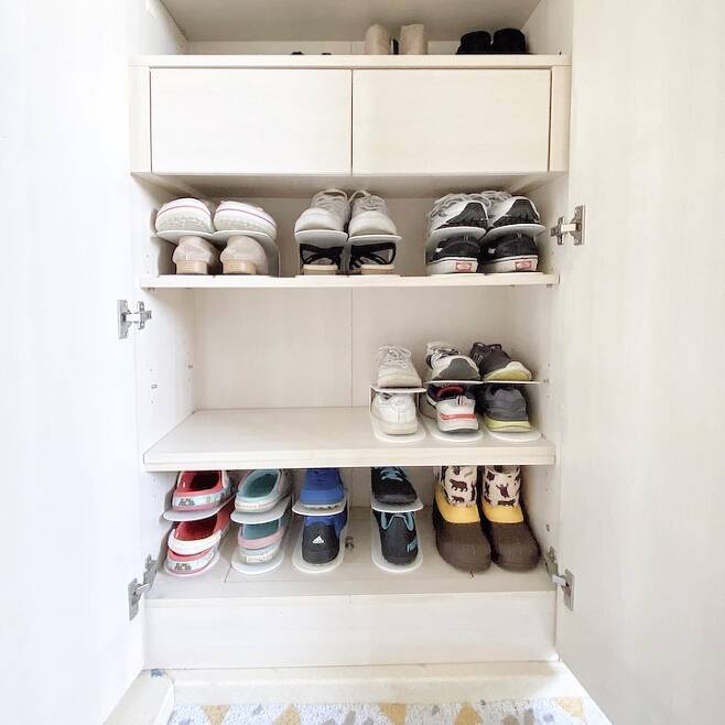 그리고 붙박이로 있는 신발장을 여유롭게 사용하고 싶어서 슈즈 홀더를 이용해서 넉넉하게 사용 중입니다! 한눈에 보이는 신발장!!!