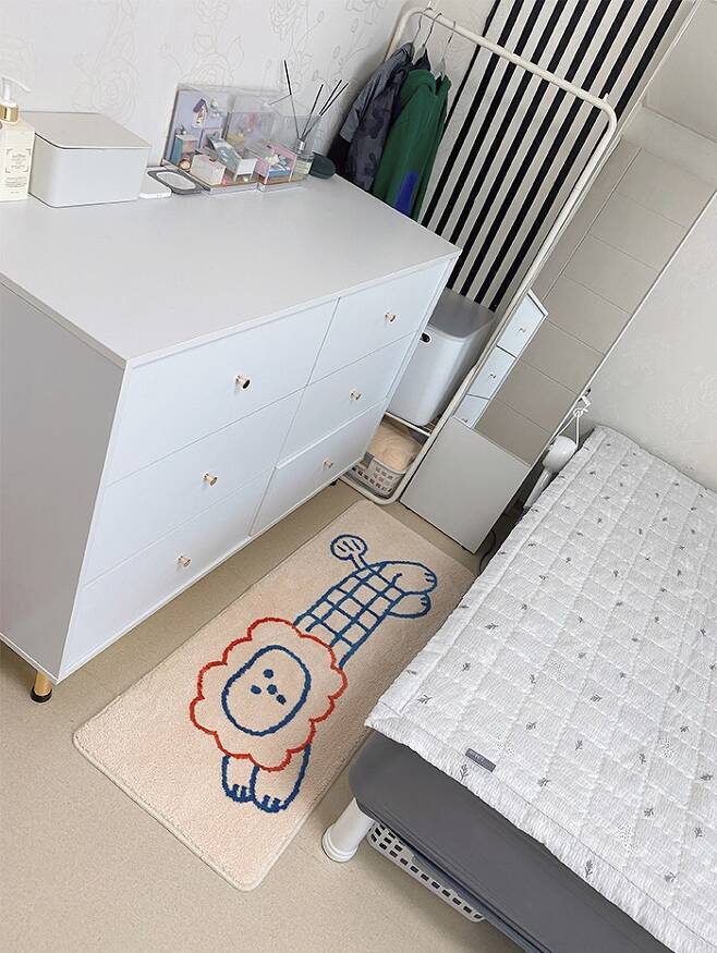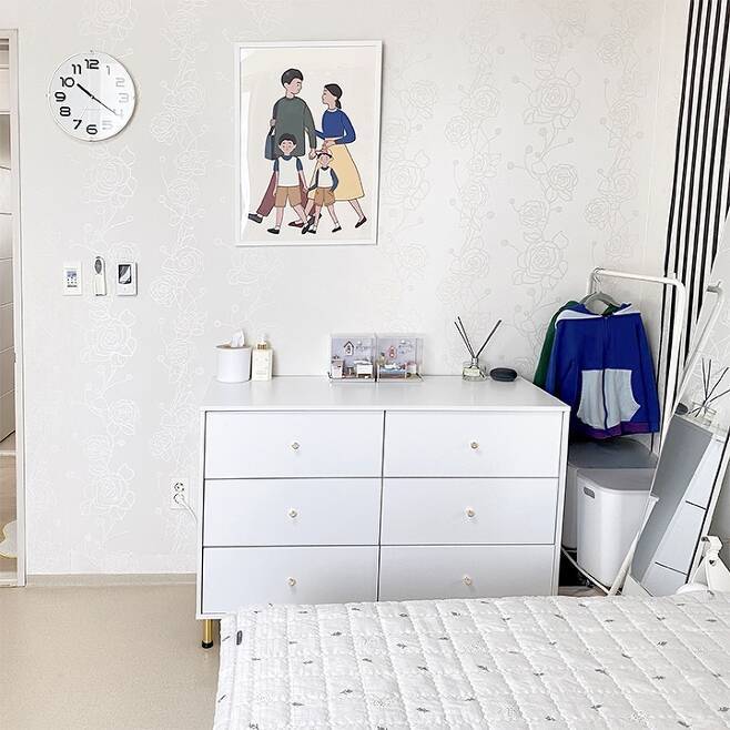 서랍 위에는 최대한 아무것도 안 두려고 노력 중이지만 아이들이 학교에서 만들어오는 작품들을 일주일에서 한 달 정도 전시해요. 이후엔 핸드폰으로 사진을 남긴 뒤 스스로 정리하게 하여 유지 중입니다.