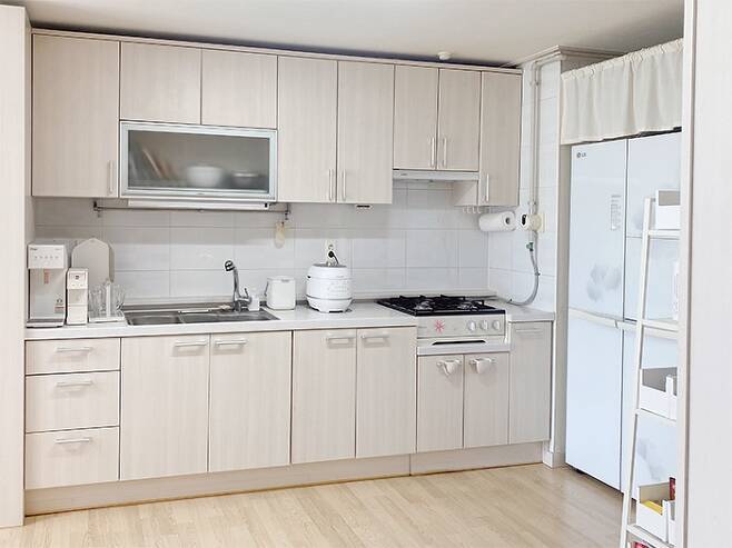 주방과 거실이 경계 없는 일체형으로 뻥 뚫린 구조예요! 주방은 특별할 것은 없지만 많은 걸 꺼내두는 걸 좋아하지 않아서 깨끗하게 유지하려고 노력 중입니다.