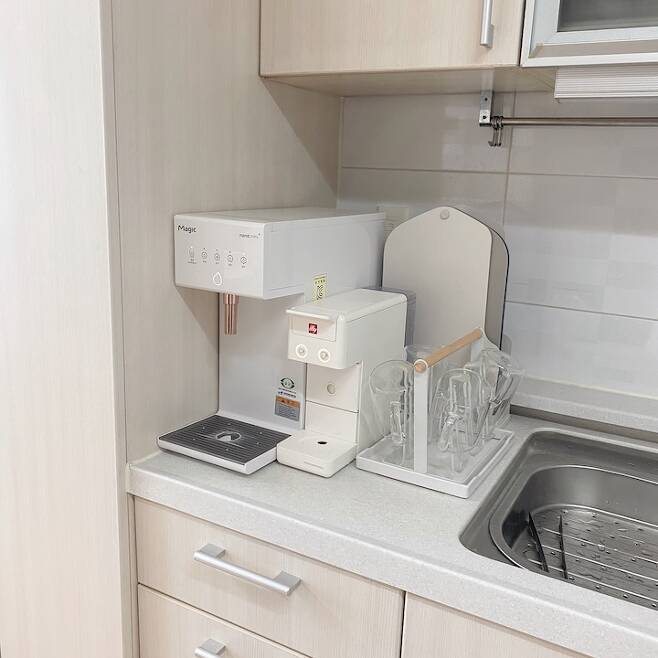 조리대에 아무것도 안 두고 싶지만 재택 중인 저는 커피가 생명입니다! >.< 컴팩트한 사이즈여서 좁은 공간에도 쏙! 들어가서 아주 맘에 드는 일리 머신이에요~ 모도리 도마는 걸이식으로 예쁘게 세워둘 수 있어서 좋은데요. 마침 뒤에 콘센트를 가릴 수 있는 저 자리가 찰떡입니다!