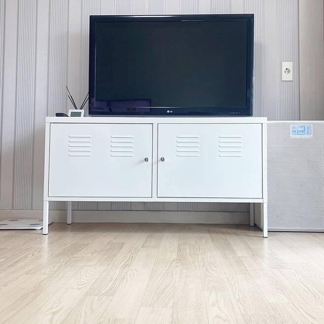 현관에서 보이는 거실 풍경입니다~ 거실은 현관문을 열면 바로 보이는 공간이라 꾸미자니 더 답답해 보이거나 지저분할 것 같았어요. 그래서 최소한의 가구와 가전으로 생활합니다. (청소가 쉬워요^0^) 거실장으로 사용하고 있는 철제 수납장에는 신랑과 아이들의 게임기를 정리해 놓았어요!