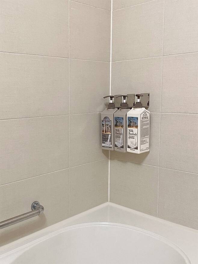 샴푸와 바스는 디스펜서 고리를 달고 청소용품은 아래쪽에 고리를 달아 건조도 빠르고 위생적이게 보관 중입니다. 이렇게 하면 물이 고여서 곰팡이가 끼는 일이 적어 취침 전 물기만 제거해 주면 언제나 보송보송해요. 건식 아닌 건식처럼 깨끗하게 사용할 수 있는 것 같아요! (물기 없는 욕실은 청소의 주기를 늘려줍니다! ^^)