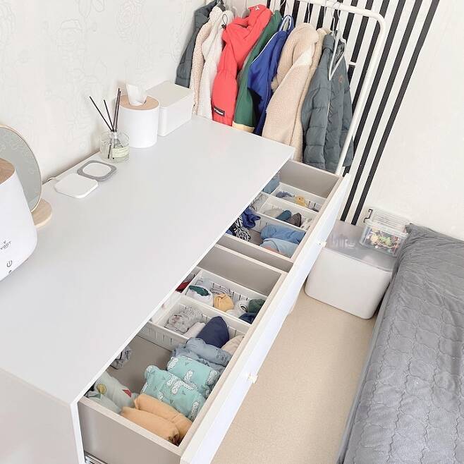 미니멀라이프인 저희 집은 옷이 많이 없어요. 아이들도 금방 쑥쑥 크기 때문에 옷을 자주 정리하기도 하고, 형제이지만 체구가 비슷해 물려줄 옷도 없어요. 그래서 옷장은 미니 행거와 서랍으로 사계절 옷 수납이 가능했어요.