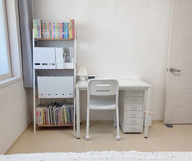 미취학 시절에는 책상도 필요 없고 딱히 지저분해 보인다는 생각을 못 했는데요. 학교에 입학하니 챙겨오는 것도 많고 본인들이 원하는 책을 구매하면서 책장이 지저분해 보이더라구요~ 그래서 파일 꽂이를 사서 마스킹 테이프로 분류해서 수납할 수 있게 해줬더니 한층 더 깔끔해 보여요^^