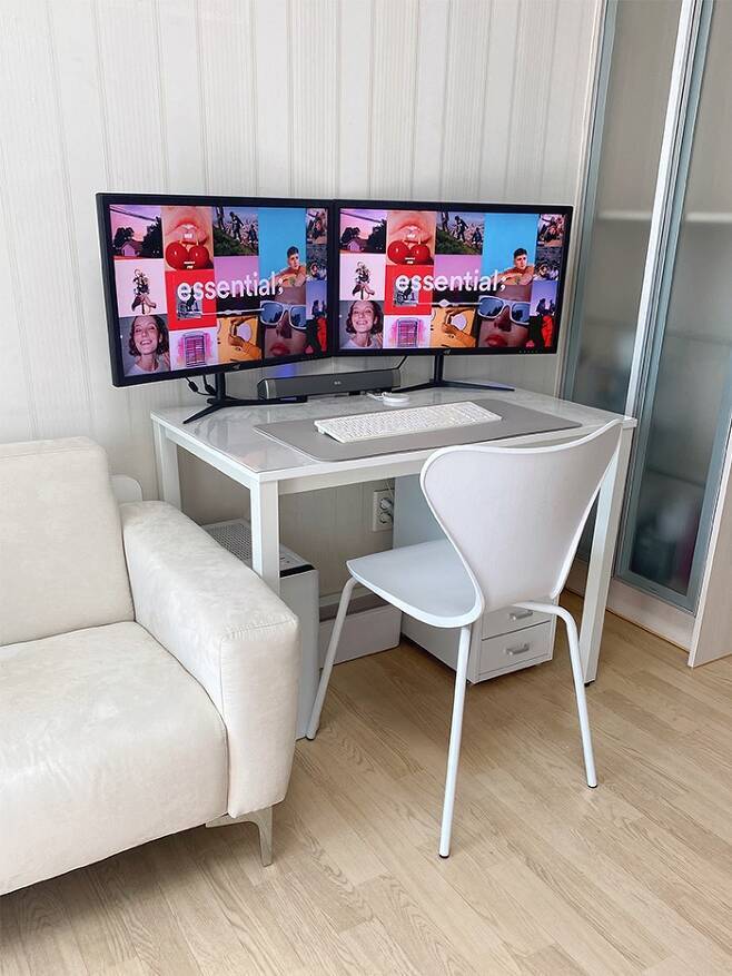 저는 최근엔 재택근무를 하고 있는데 따로 작업실이 없어요, 협소하지만 가구와 짐이 많이 없는 덕에 거실 한 켠에 책상을 두고 작업을 하고 있습니다. 붙박이로 반투명 유리 수납장이 있는데 반투명이다 보니 물건을 꽉꽉 채우면 너무 지저분해 보여서 여기 또한 최소한의 수납으로 활용하고 있습니다^^