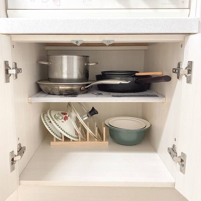 냄비와 프라이팬 역시 꼭 필요한 만큼만! 여유로운 공간은 찾아 쓰기도 편하고 정리하기도 쉬워요~! 이렇게 정리하고 나면 한층 더 깔끔한 주방을 유지할 수 있어요!