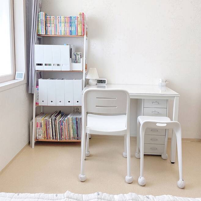 그리고 아이가 두 명이다 보니 둘이 나란히 앉거나 학습지 선생님이 오시면 간의 의자를 하나 더 추가하여 사용 중이에요.