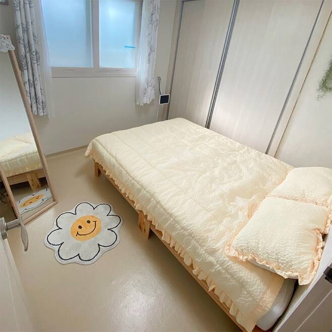 저희 집은 복도식이라 창문을 통해서 침대 쪽을 찍어보았어요~! 전신거울 뒤에는 슬림 서랍장이 쏙~ 숨어 있습니다^^