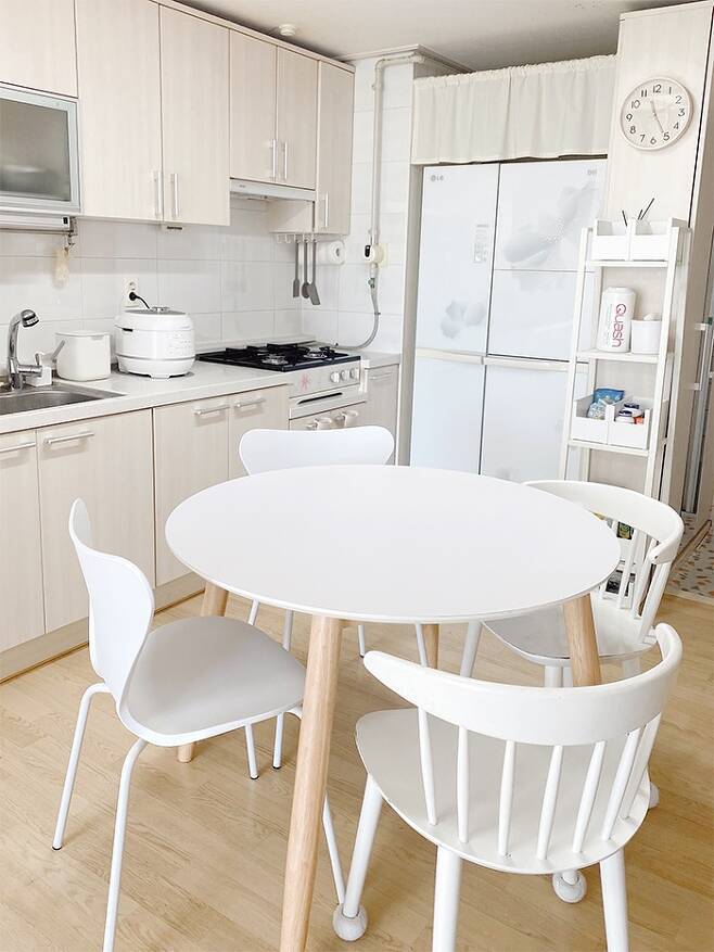 저희 집은 원래는 식탁을 둘 수 없는 구조인데 바른 식사 자세를 유지하기 위해서 식탁이 필요했어요. 벽에 붙여 사용할 공간은 없어서 원형 식탁을 선택했어요. 필요에 따라 조금씩 이동하면서 사용하는데 만족스러워요.