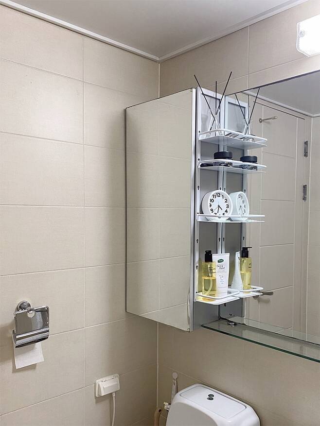 물때가 자주 끼는 화장실! 수납은 되도록 공중부양을 하고 있어요. 소모품 수납공간이 모자라서 걸이형 선반을 하나 더 추가해서 달았구요.