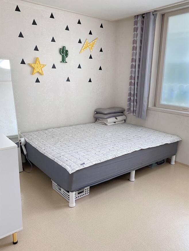 아이들이 어릴 때는 뭔가 아이들 방 같아 보이고 싶어서 침대 옆에 이래저래 스티커 같은 걸 붙여 두었는데요. 이제 와서 떼어내려 하니 자국이 남아 더 지저분해 보여서 오래된 느낌이지만 그냥 쓰기로 했어요!
