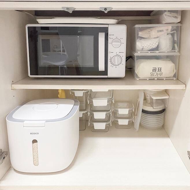 홈바나 렌지대를 둘 수 없기 때문에 작은 사이즈의 전자레인지를 하부장에 쏙~! 넣어 필요할 때만 잘 사용하고 있어요!