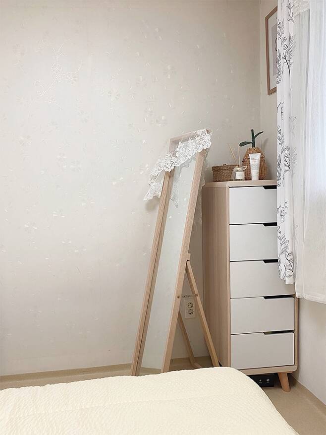 저희 집은 복도식이라 창문을 통해서 침대 쪽을 찍어보았어요~! 전신거울 뒤에는 슬림 서랍장이 쏙~ 숨어 있습니다^^