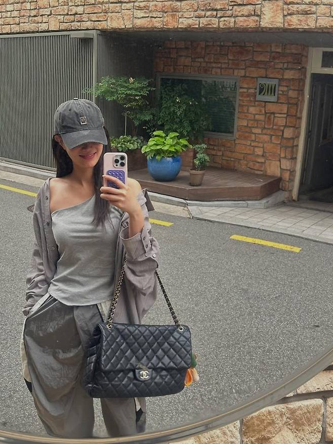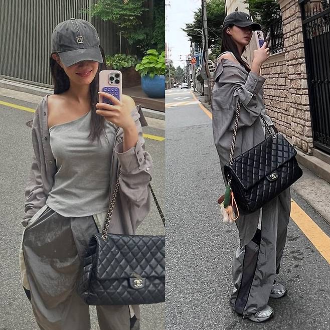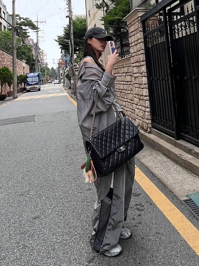 또 여기에 블랙 퀼팅 체인백과 볼캡, 그리고 실버 스니커즈까지 매치해 믹스앤매치의 데이트룩을 완성했다.