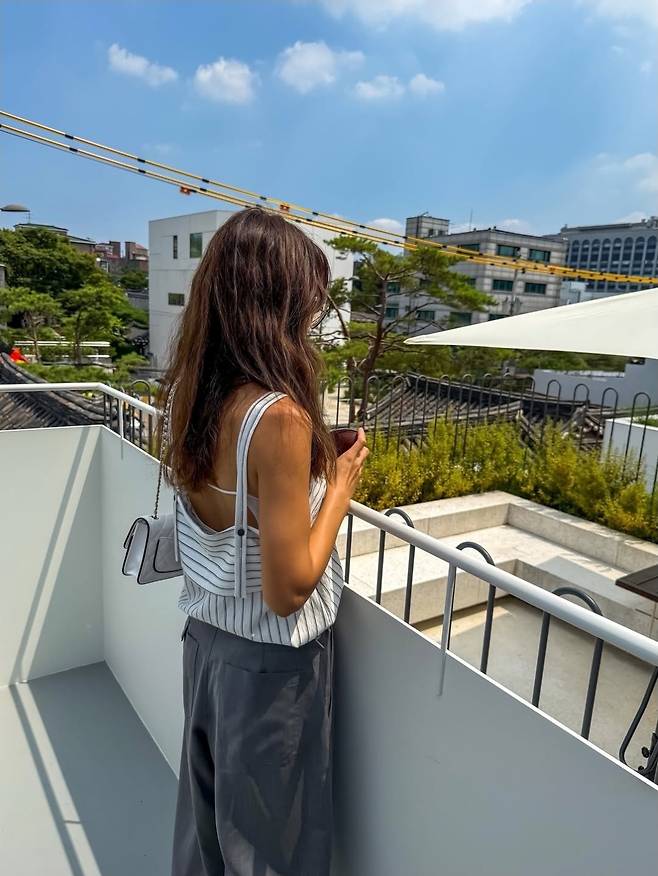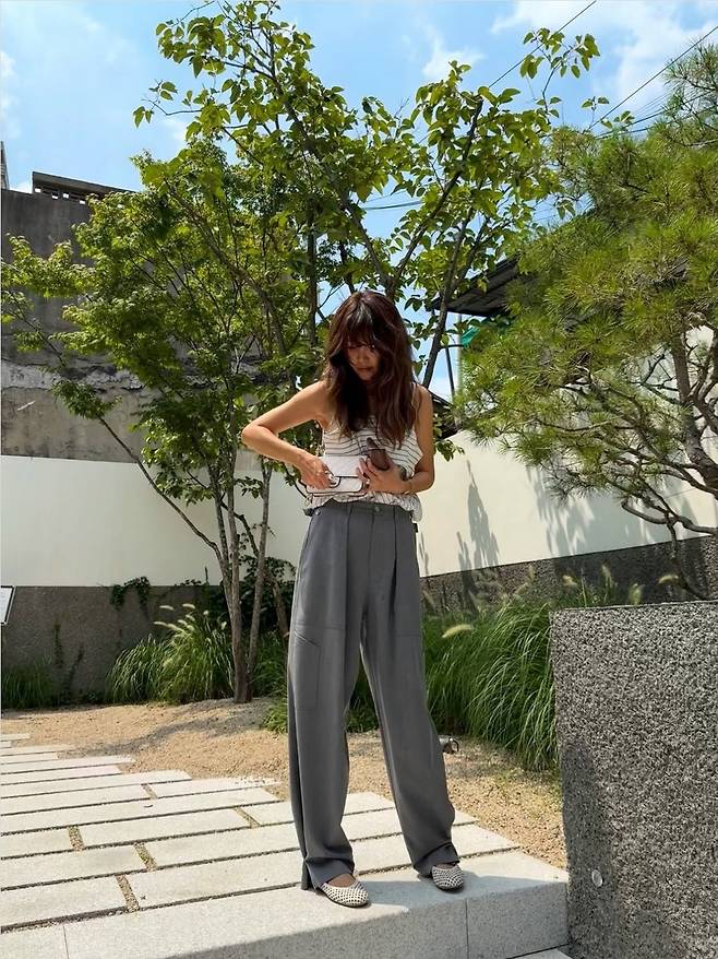 채정안은 스트라이프 패턴의 슬리브리스 톱에 그레이 와이드 팬츠를 매치해 내추럴하면서도 감각적인 여름 룩을 완성했습니다.
