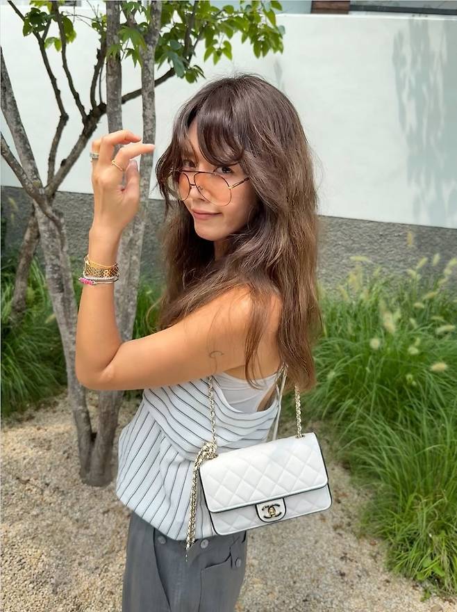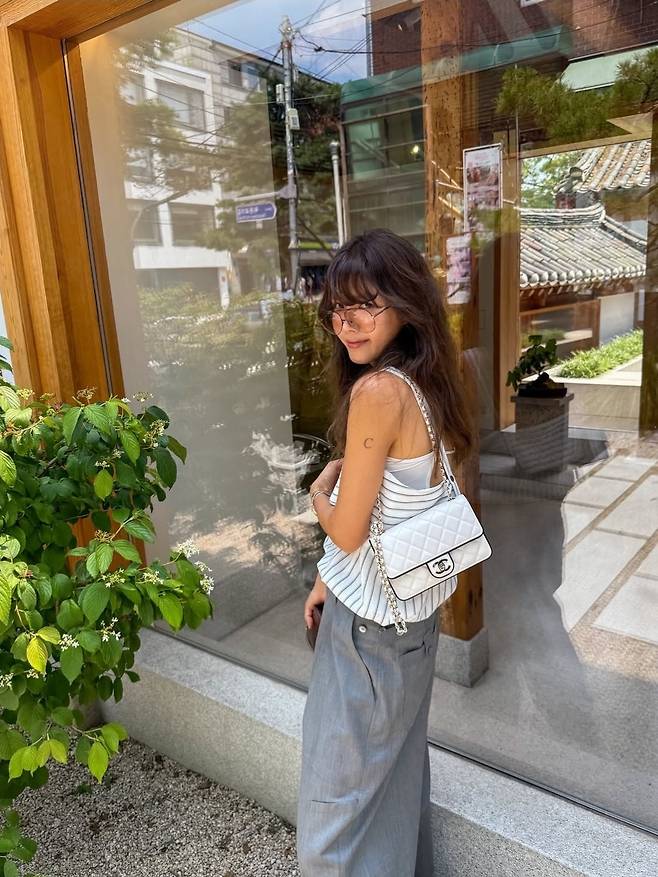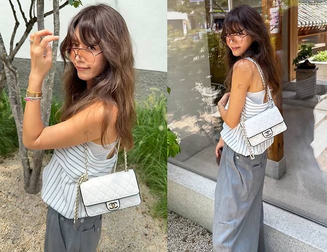 찰랑이는 텍스처와 여유로운 핏이 바람결을 따라 흐르며 편안한 무드를 자아냈고, 화이트 퀼팅 샤넬 체인백으로 우아함을 더했습니다.