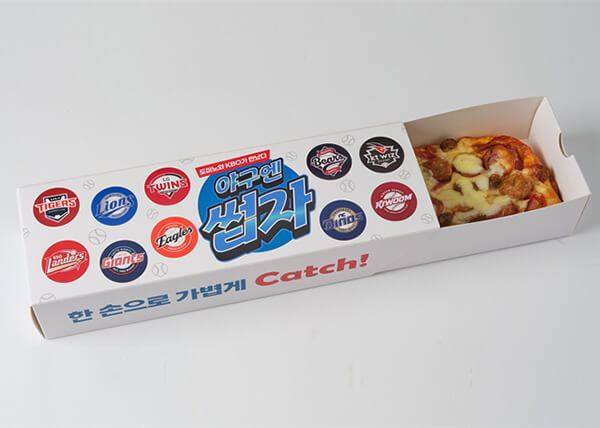 한국 도미노피자는 한국프로야구와 협업한 피자 ‘썹자’를 출시했다. 썹자는 KBO 리그 10개 구단 로고가 새겨진 특별 패키지에, 한손으로 가볍게 잡을 수 있는 길쭉한 모양의 피자다. 썹자 피자는 ‘맥콘 베이컨 피자’와 ‘소시지 맥스 피자’, 스테디셀러 메뉴인 ‘포테이토 피자’와 ‘리얼불고기 피자’ 등의 4종으로 구성됐다. 편하게 먹을 수 있는 길쭉한 직사각형 모양의 피자로, 4종 모두 가격은 7,900원이다.