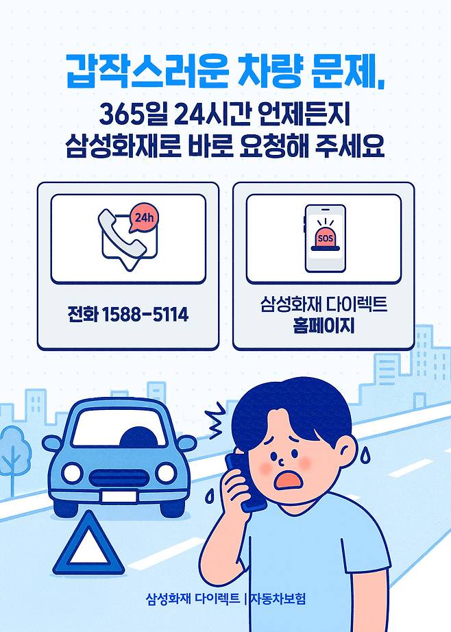 - 전화하기 어려운 상황에서는 모바일 앱/홈페이지 → [자동차 고장출동 요청]으로 간편하게 신청할 수 있습니다.