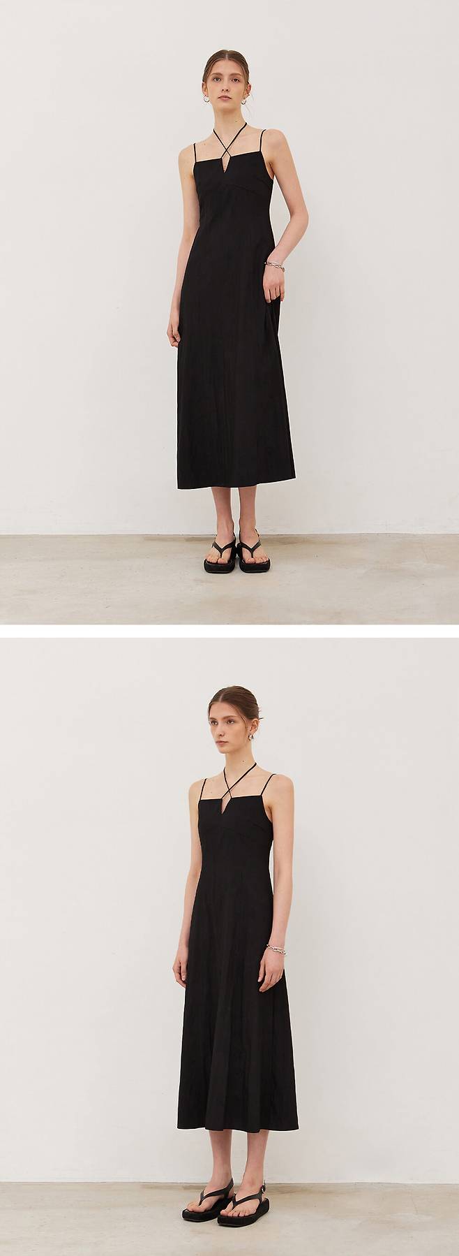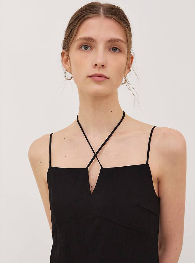 넥스트링 포인트 원피스로 앞판 절개라인으로 날씬해 보이며 넥스트랩으로 다양한 연출이 가능합니다.
