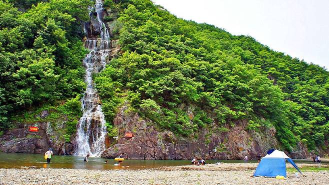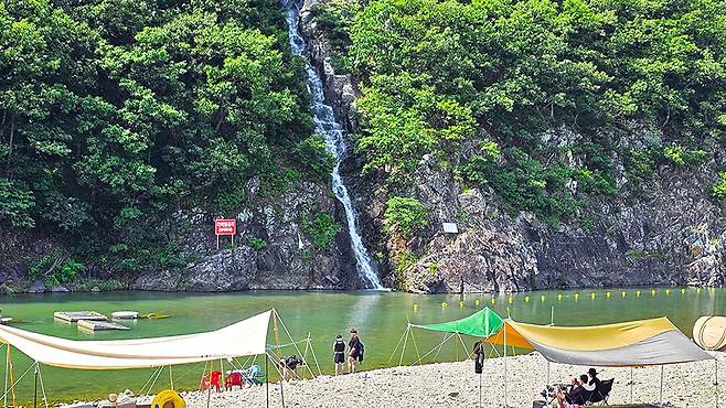 폭포 아래 펼쳐진 넓은 계곡은 물놀이와 캠핑을 즐기기에 최적의 장소다. 물 깊이도 다양해 어린이를 동반한 가족부터 연인, 친구끼리 찾는 캠핑족까지 모두가 만족할 수 있다.