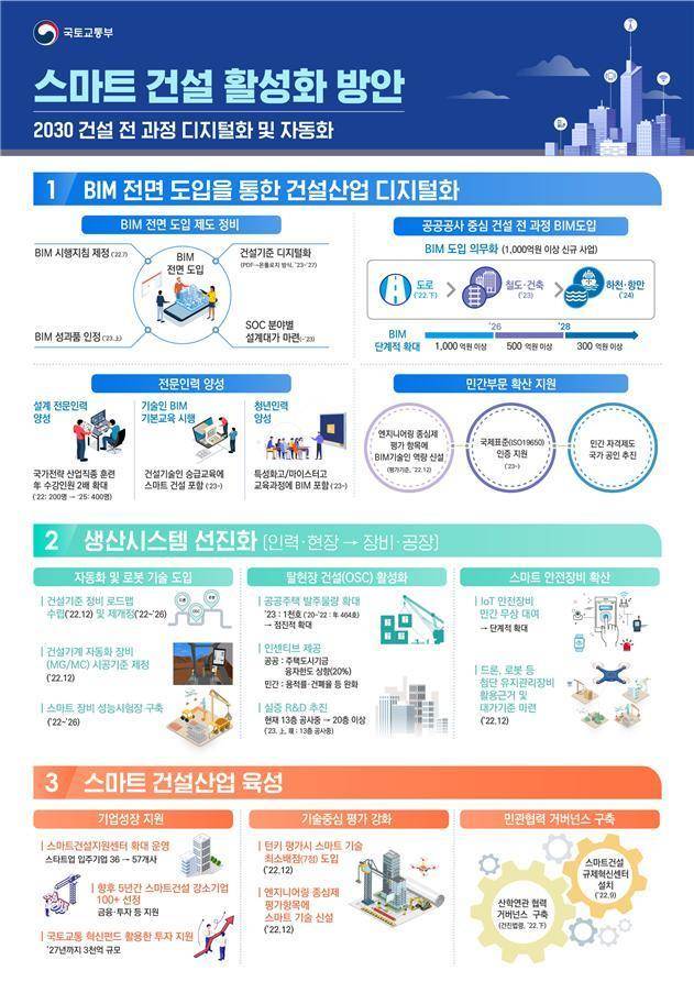 1000억 원 이상 공공공사에 '건축정보모델링(BIM)' 기술이 의무적으로 적용되고, 생산 시스템 선진화를 위해 '탈현장 건설(OSC·Off-Site Construction)' 활성화가 추진된다.