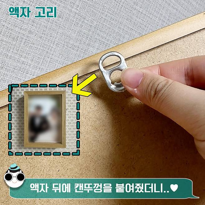 캔뚜껑을 액자 뒤에 꼬옥 붙여주면 그게 바로 액자 고리가 되걸랑요. 액자 뒤에 못을 박거나 실리콘, 접착제를 이용해 고리를 붙여주면 완성. 너무 쉽죠?