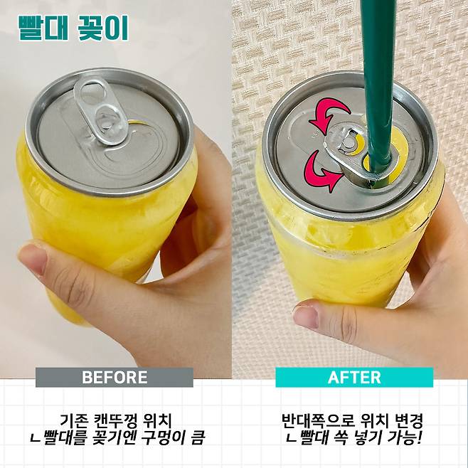 이럴 땐 캔뚜껑을 반대로 돌려준 후, 캔뚜껑 구멍에 빨대를 쏙 넣어주시면 된답니다. 훨씬 편하게 음료를 마실 수 있다는고~