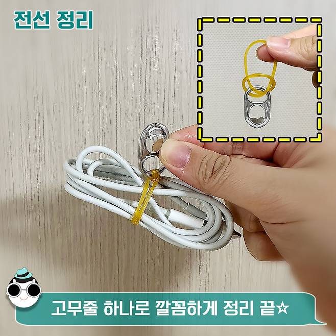핸드폰 케이블이나 전선 등을 이 고무줄로 돌돌 감아준 뒤 캔뚜껑 고리에 쏙 끼워주면 정리가 끝난답니다.