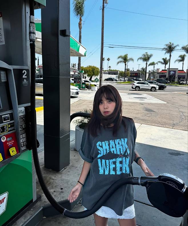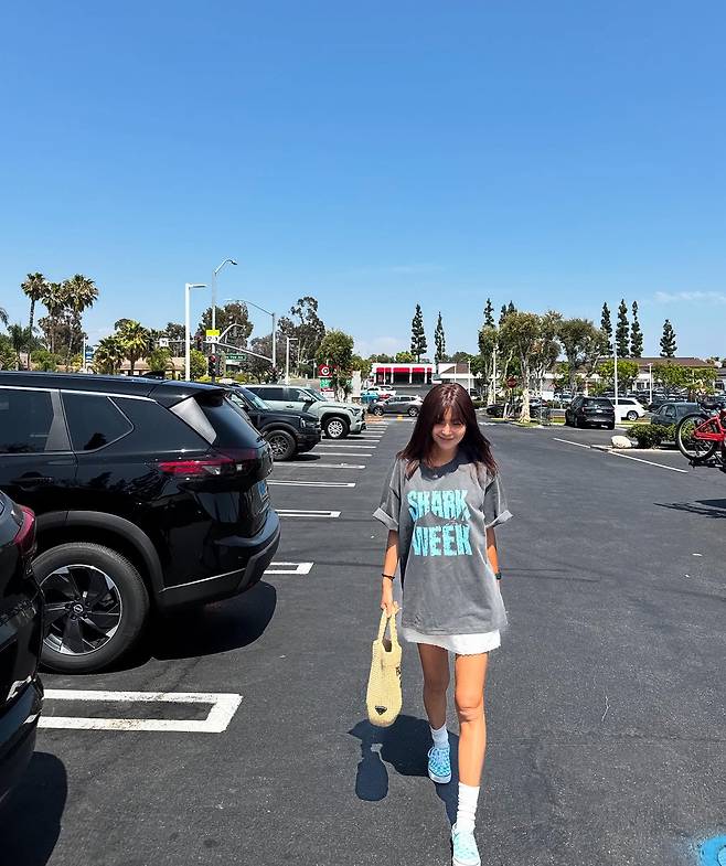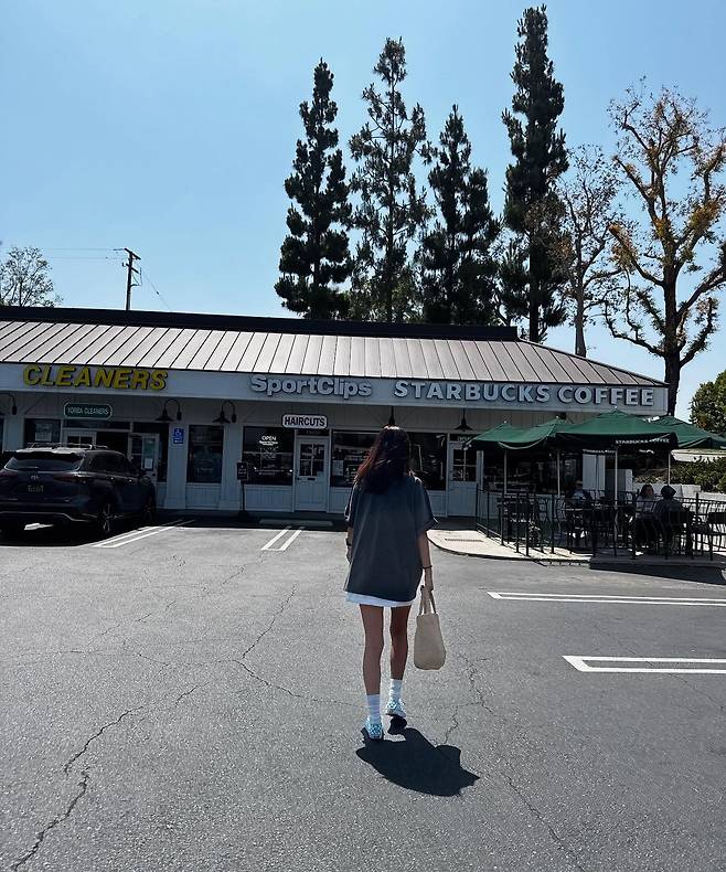 그늘 없이 쨍하게 내리쬐는 햇살, 그 아래에서 이영은은 여유로운 LA 무드를 완벽히 담아낸 룩을 보여줬어요.